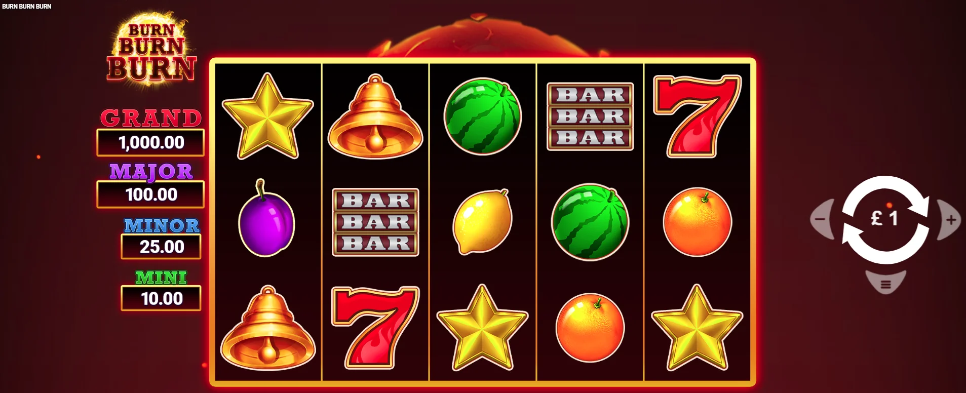Just like many other fruit machine-inspired releases, players can start by setting a stake in the Burn Burn Burn slot. Upon spinning the reels, random symbols are introduced to the play grid, with matching ones needing to land next to one another to potentially trigger a prize return.