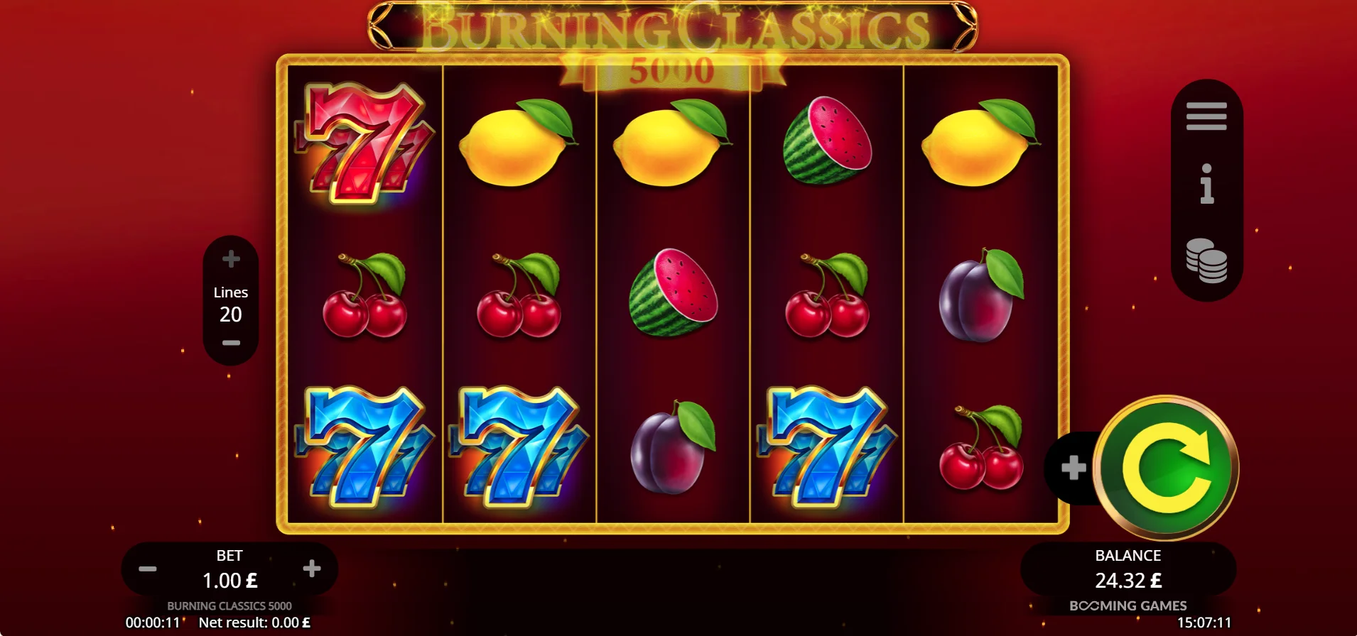 A myriad of base game symbols make up the reels in the Burning Classics 5000 slot, which vary in value and the imagery that represents them. All symbols on the reels are inspired by traditional fruit machines, with the lower-valued ones featuring fruit imagery and the higher-valued ones featuring uniquely coloured 7s.
