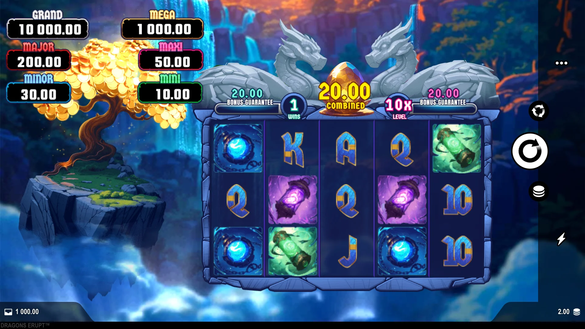 Getting back around to the Dragons Erupt slot specifically, this uses a play table that consists of 5 reels and 3 rows, a layout that is standard for online slot games nowadays. The number of paylines across the stone-framed segments is set at 20, and fixed above this play grid is a golden egg. Off to the left of the screen is a golden tree filled with coins, in front of which the Mini, Minor, Maxi, Major, Mega, and Grand jackpots are displayed.