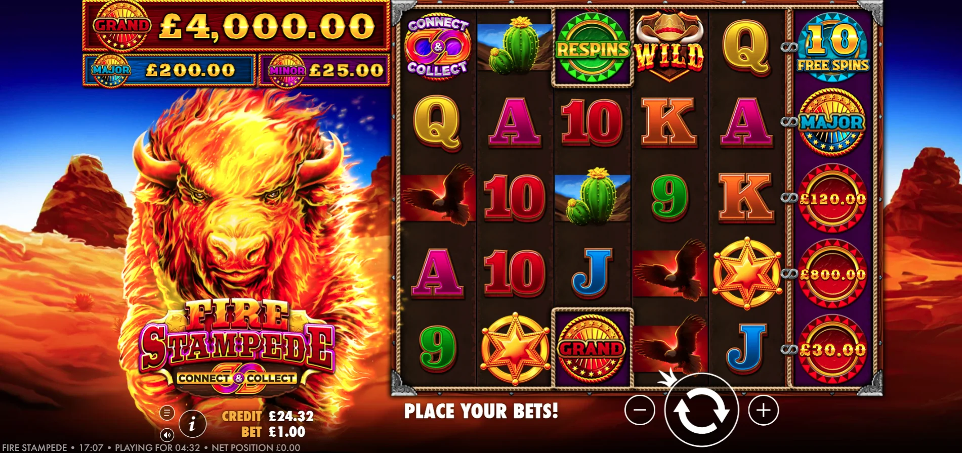 Free Spins Feature – The Fire Stampede 2 Free Spins round could potentially be triggered by landing 3 or more Scatters at the same time or by reaching it via Connect & Connect symbols. During this bonus round, Wild symbols could carry multipliers of 2x or 3x.