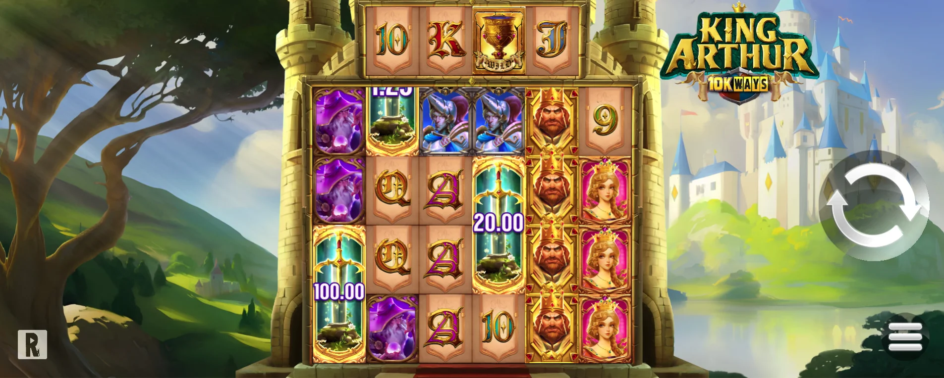 The watchtowers of a mediaeval castle line both sides of the reels here, with a slight golden trim outlining the symbol segments fashioned like banners. A couple of trees can be seen across a green valley here, with a calm pond being visible to the right of the King Arthur 10K Ways play table. In the distance, a large marble castle with a blue roof can be seen standing tall above the landscape below. This detail is one not only found in King Arthur 10K Ways, but also other fantasy titles such as Knights of the Golden Egg and Arctic Sorcerer GigaBlox.