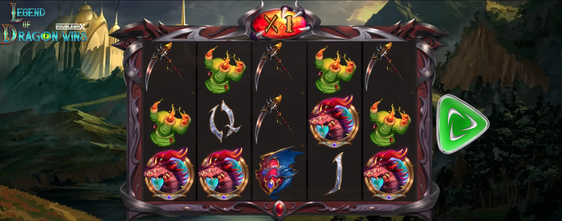 Rolling green hills within a mountain-lined valley fill a majority of the backdrop in the Legend of Dragon Wins DoubleMax slot. In the distance, however, a large castle can be seen perched on the top of a hill, just like the ones seen in King Arthur 10K Ways and Arctic Sorcerer GigaBlox. Some dark storm clouds loom overhead, creating a somewhat ominous atmosphere for this Legend of Dragon Wins DoubleMax slot in turn.