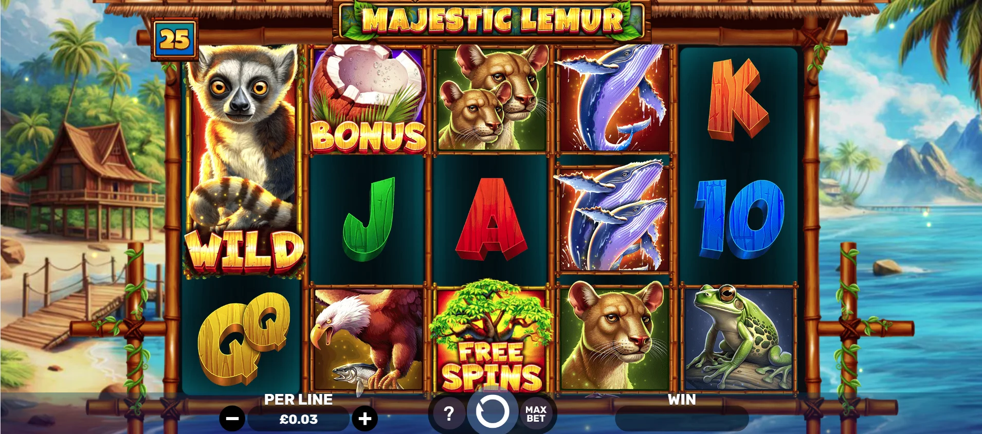 The play table in Majestic Lemur is contained within a wooden frame, with a thatched roof, fitting in with the overall tropical island setting, and the grid within the play table hosts 5 reels, 3 rows, and 25 available paylines. This grid layout is commonly seen across many UK online slots, with paylines themselves being triggered when 3 or more matching symbols land in a row, starting from the leftmost reel.