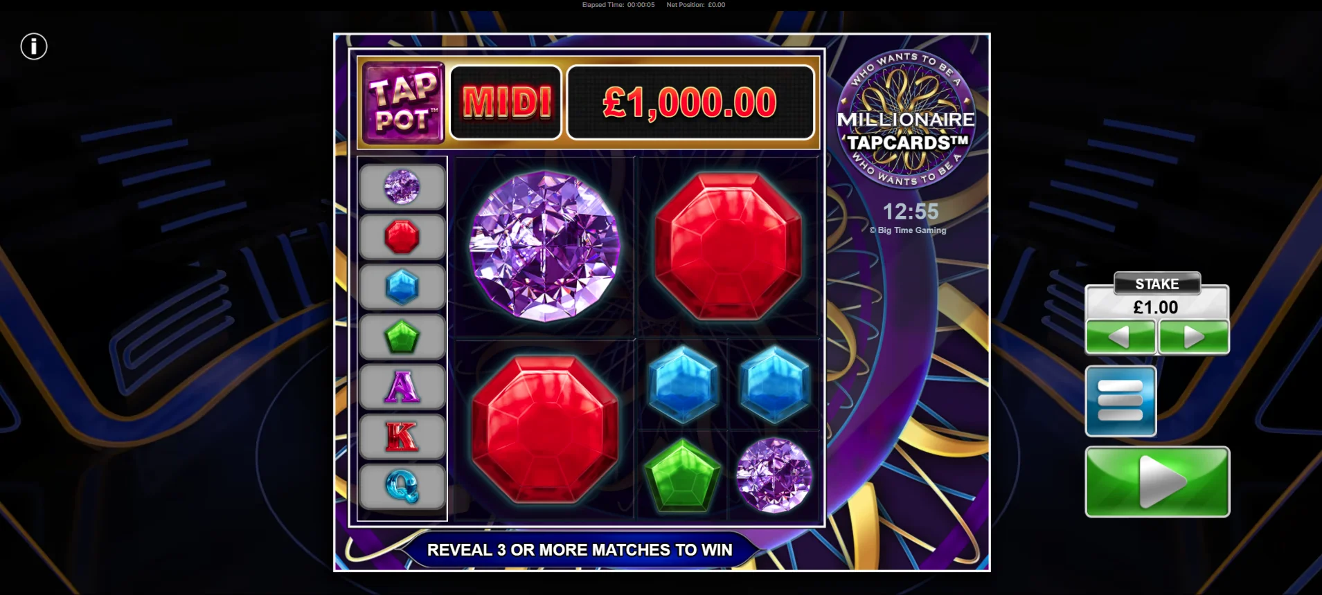 There are fewer symbols in Millionaire Tapcards than in a standard slot game, with higher and lower-value symbols still being differentiated in a similar way. Lower-value symbols are directly inspired by playing cards, whilst the higher-value symbols contrast and are represented by gems, another popular type of slot base game symbol.