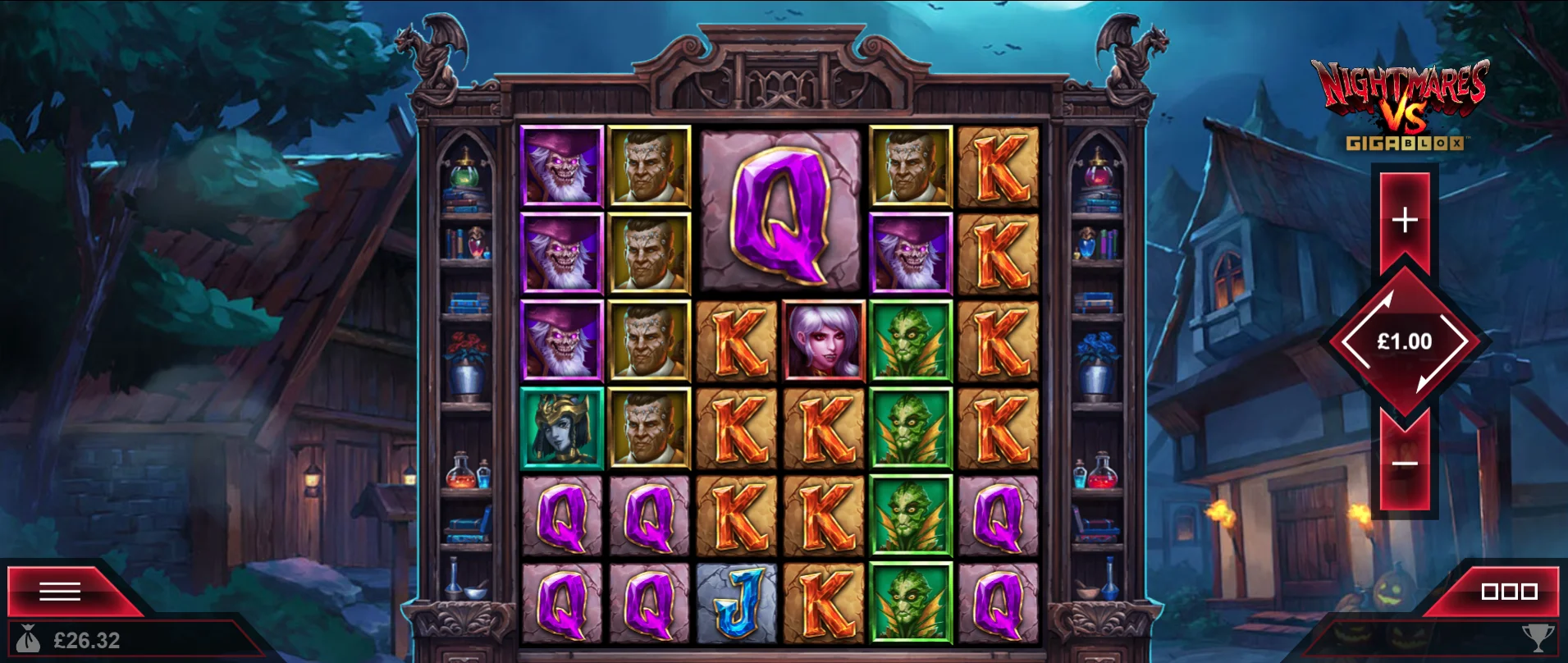 An abandoned, potentially haunted village fills the backdrop in the Nightmares VS GigaBlox slot. Amongst the trees and wooden structures is a thick layer of fog, adding to the dark atmosphere of this game already. A couple of bats are illuminated by the full moon overhead, with the gargoyles fixed to the top of the reels somewhat resembling those seen in Immortal Romance and Ghost Father.