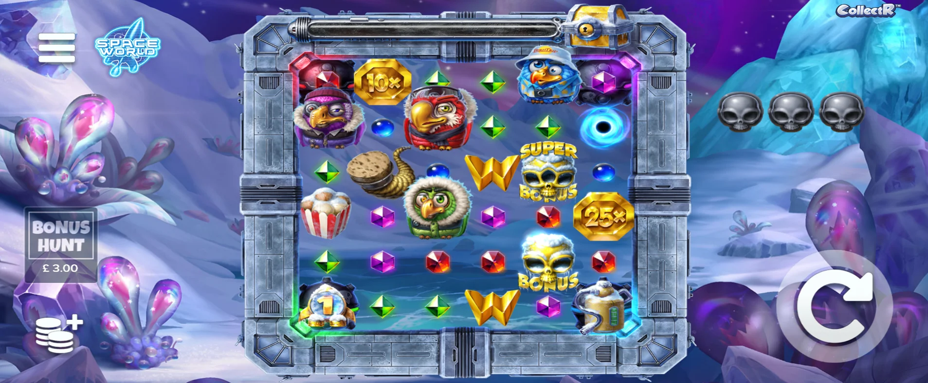 Like all online slot games, before spinning the reels, gamers can select from the different bet stake options available in Pirots 4. In the gameplay, there are no paylines active, and instead, the CollectR mechanic is used to determine symbol combinations in play. The CollectR mechanic powers the play grid, allowing one of the four coloured birds to collect their corresponding coloured gem when adjacent.