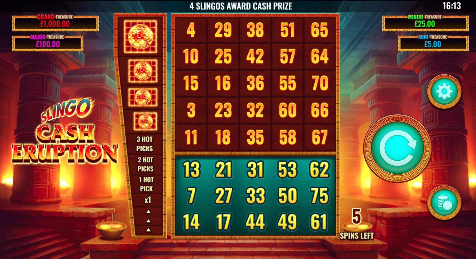 Hot Picks – The Hot Picks bonus game will be awarded for 5 to 7 Slingos being achieved. Achieving 5 Slingos will award 1 pick on a 2x3 grid, 6 Slingos will award 2 picks on a 3x3 grid, and 7 Slingos will award 3 picks on a 4x3 grid. At 5 Slingos, gamers can reveal multipliers or trigger the Cash Eruption bonus. At 6 slingos, gamers can reveal a multiplier or a Jackpot prize. At 7 Slingos, gamers can reveal multipliers, Jackpot Prizes, or trigger the Cash Eruption bonus.