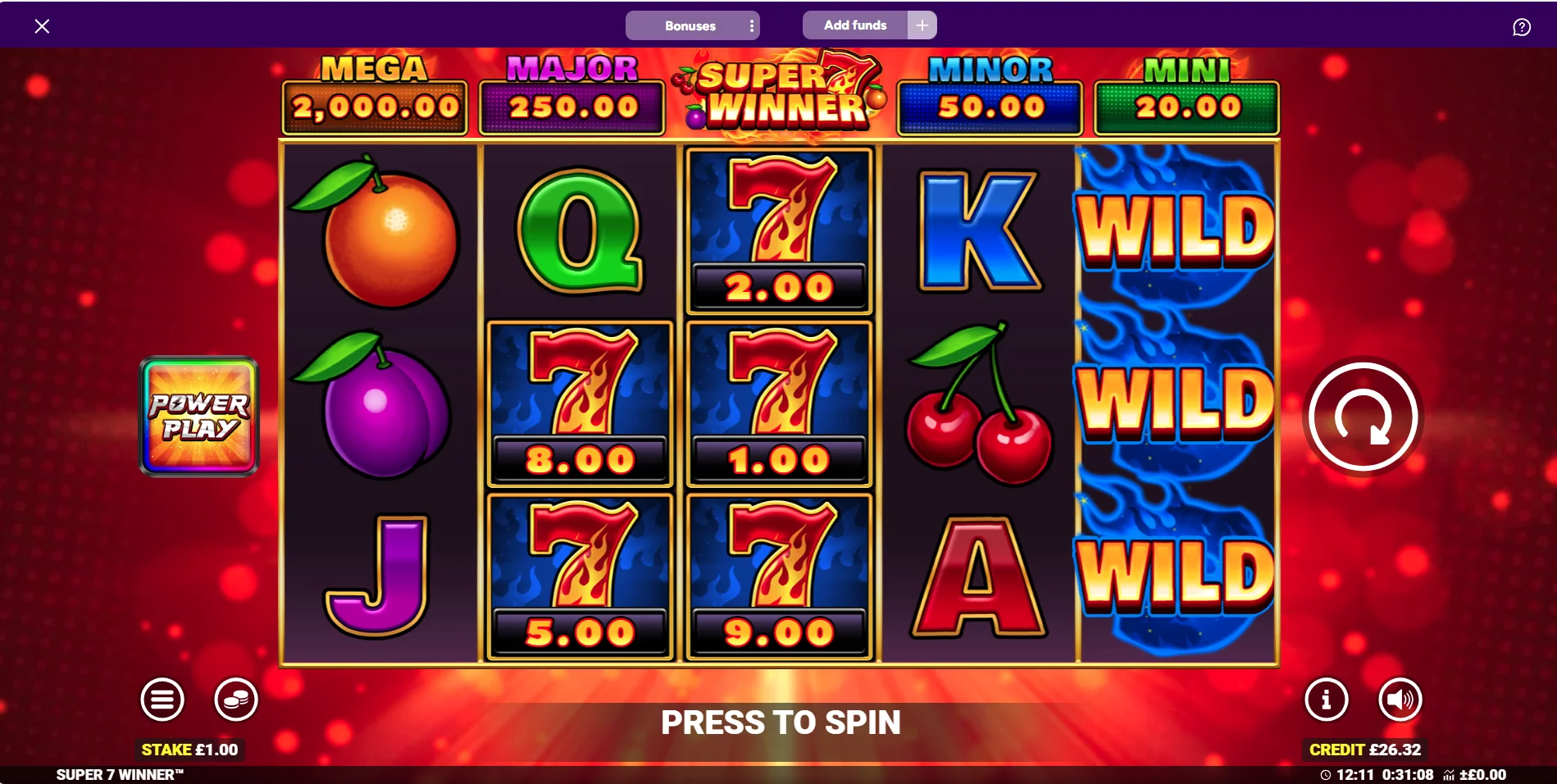 Due to the Mega fixed jackpot included by Blueprint, the maximum potential win in the Super 7 Winner slot is 10,000x.