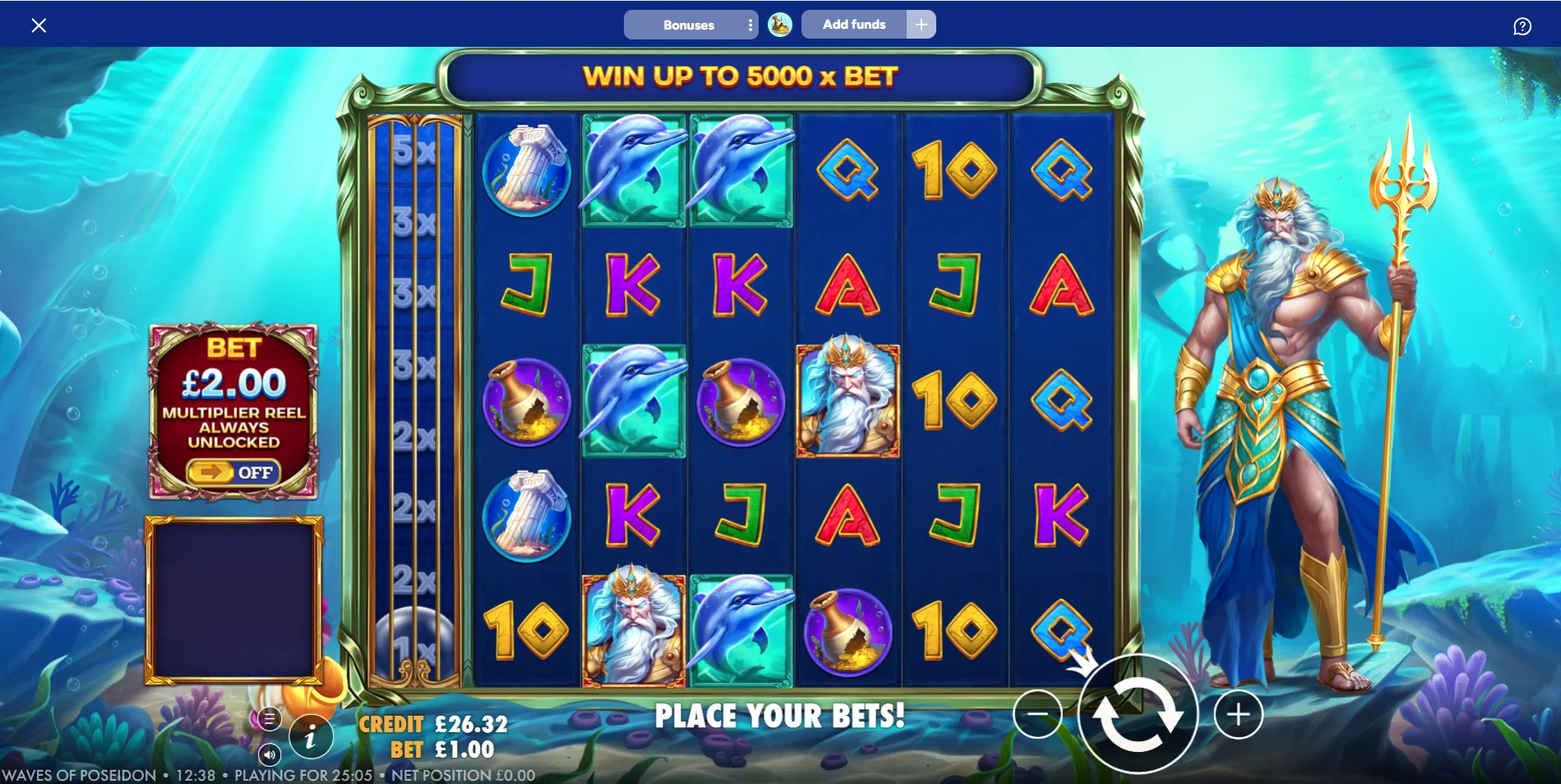 Featuring the Greek god of the sea, Waves of Poseidon is an online slot game released by Pragmatic Play in 2025. Taking place deep underwater, this Greek mythology-themed slot is based around Poseidon, with the popular Greek God being seen on the right-hand side of the gameplay. Unique game mechanics such as Pay Anywhere paylines and multipliers make the Waves of Poseidon slot unlike any other casino slots on the market!