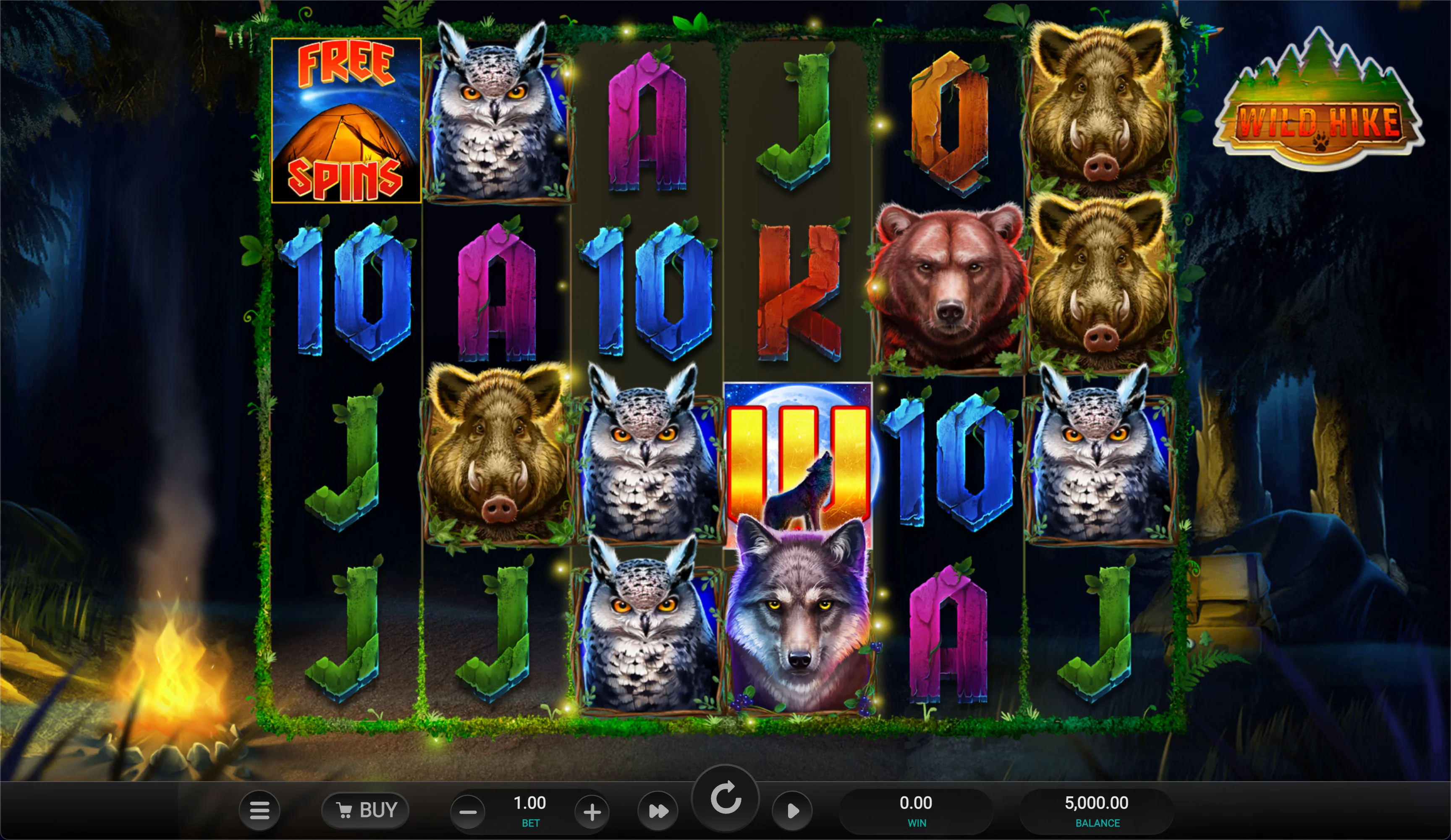A dark forest fills the backdrop in the Wild Hike slot, with the densely spaced tree trunks being illuminated by a burning campfire in the bottom left corner of play. A raven sits upon some rocks on the opposite side of the play screen, with a couple of animated fireflies floating across this forested setting. Even with Wolf Gold and Big Mighty Bear being part of the same genre, the graphical style of this title remains unique thanks to such impressive details.